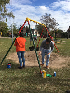 El mediodía nublado acompañó a la Juventud del Pro de Pilar, algunos funcionarios municipales y la agrupación 25 de Mayo, el pasado domingo 9 de Junio en el barrio Lumi, Derqui. Se dividieron de forma organizada: a algunos les tocó pintar y restaurar la plaza principal del barrio; a otros, realizar los timbreos y repartir las banderitas de argentina por el mes de la bandera. Además, compartieron medialunas y chocolatada con los vecinos de la feria de trueque.